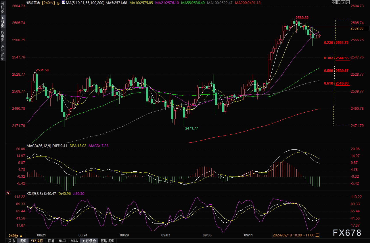 4小时级别:局部倒V反转,MACD死叉,金价回调受到布林线中轨支撑,但在顶破2582.11前,短线金价存在进一步回调风险,布林线中轨支撑目前在2567.23附近,隔夜低点支撑参考2560.67附近位置,如果失守该支撑,则增加短线看空信号;2471以来涨势的38.2%回撤位支撑在2545附近,50%回撤位支撑在2530.67附近,强支撑参考61.8%回撤位2516.80附近位置。