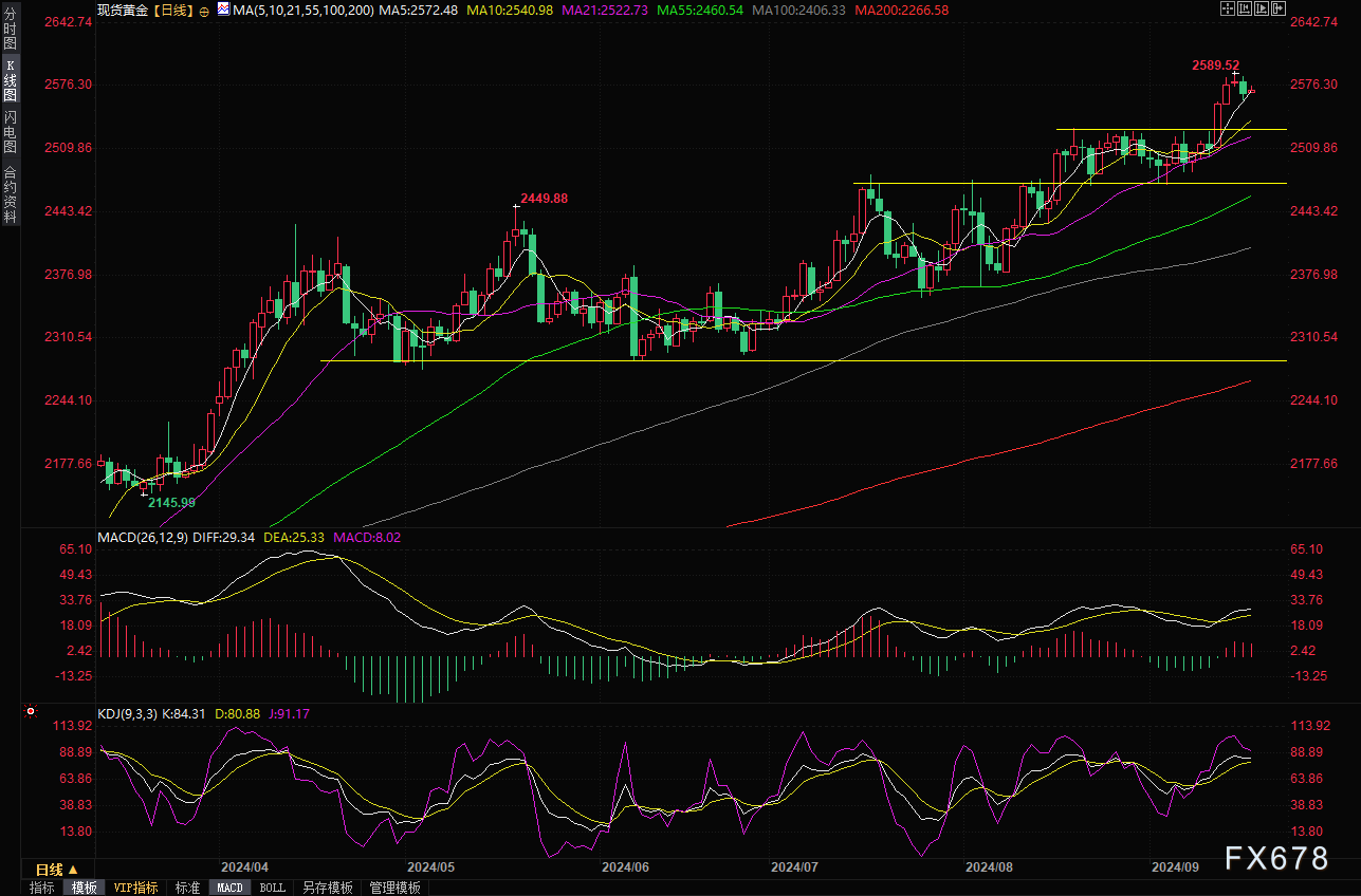 技术面来看,日线级别:MACD顶背离,K线在高位出现“黄昏之星”的顶部信号,KDJ也发出超买信号,在金价收盘于2585上方前,金价短线见顶的可能性较大;后市金价大概率会回踩8月20日高点2531.58附近支撑,如果失守该支撑,则金价偏向进一步跌向9月低点2472一些支撑,强支撑参考100日均线2406附近位置,6月初2287以来涨势的61.8%回撤位支撑也在该位置附近。