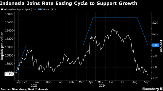 在本季度上涨近7%后,印尼盾兑美元汇率接近一年来的最高水平,这在很大程度上要归因于美联储可能降息以及印尼国内稳定的低通胀。这给了Warjiyo尽早采取行动的空间,尤其是如果美联储降息力度更激进,可能导致印尼盾兑美元面临进一步走高风险。
