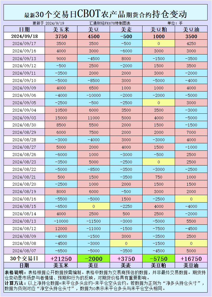 增加CBOT玉米投机性净多头;增加CBOT大豆投机性净多头;增加CBOT小麦投机性净空头;增加CBOT豆粕投机性净多头;增加CBOT豆油投机性净多头。
