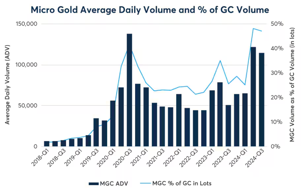 微型黄金期货(MGC)为投资者提供机会以10:1来对冲100盎司黄金期货合约。仅为基准黄金期货合约规模的十分之一,微型黄金期货是为满足以下投资者而定制:希望以较小增量交易实物黄金的活跃个人投资者,和希望以较便宜的替代工具来交易全球规模最大和最具流动性的黄金期货合约之投资者。