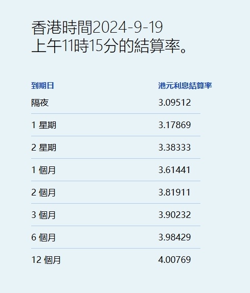 美联储减息0.5%,在联系汇率制下,香港金管局今日亦将贴现窗基本利率下调50基点。港元拆息今见短息升、中长息落。其中,隔夜息急涨41基点,升穿3%,报3.09512%,逾一周新高,但与楼按相关的一个月拆息则连跌六天,报3.61441%,为去年5月3日以来最低,一周拆息升17基点至3.17869%。