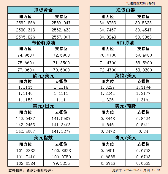 汇通财经APP讯——9月19日欧市黄金、白银、原油、美元指数、欧元、英镑、日元、瑞郎、澳元支撑阻力位一览。