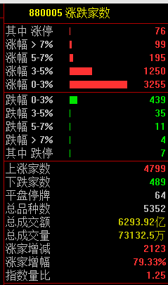 市场共4799只个股上涨,76只个股涨停,489只个股下跌。