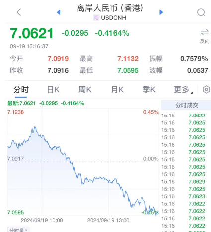 离岸人民币汇率也在上涨,日内一度涨超300点,升破7.06关口。