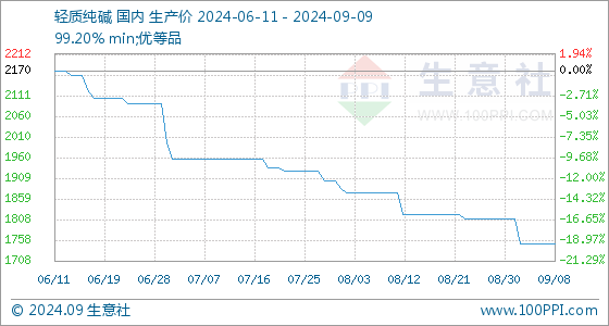 9月9日,生意社轻质纯碱基准价为1750.00元/吨,与本月初(1810.00元/吨)相比,下降了-3.31%。