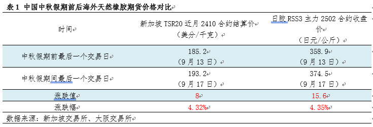 中国中秋假期间海外天然橡胶期货价格呈现上涨走势。截至9月17日(中秋假期间最后一个交易日),新加坡TSR20近月2410合约结算价193.2美分/千克,较节前最后一个交易日上涨8美分/千克,涨幅4.32%;日胶RSS3主力2502合约收盘价格374.5日元/公斤,较节前最后一个交易日上涨15.6日元/公斤,涨幅4.35%。天然橡胶金融属性较强,商品联动性及周边市场的影响下,助力节后国内天然橡胶期货走势开盘。