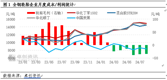 以全钢轮胎为例,据卓创资讯数据,8月份其主要原材料人民币泰混均值14465.91元/吨,丁苯橡胶均价14906.82元/吨,顺丁橡胶均价14523.86元/吨,全钢轮胎理论生产利润亏损33.87元/吨。进入9月份后,橡胶价格延续涨势,中秋节后天然橡胶更是处于领涨地位,对于下游而言成本压力高企,采购原料心态势必谨慎,对原料涨幅跟进预计偏缓,将限制胶价上涨。
