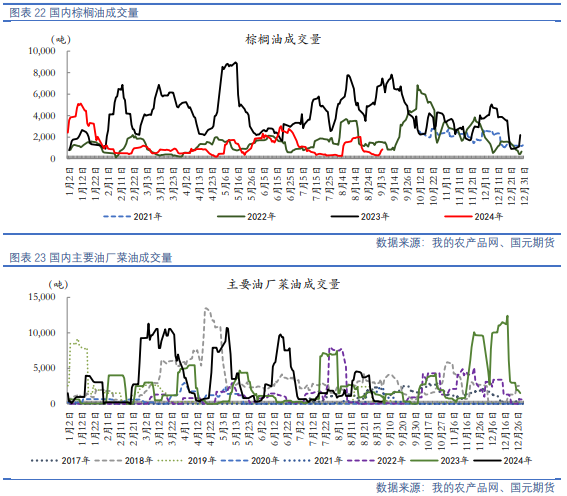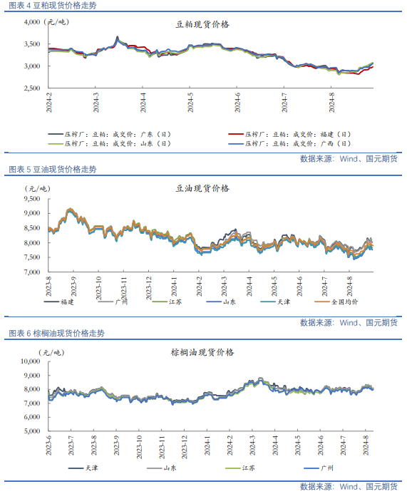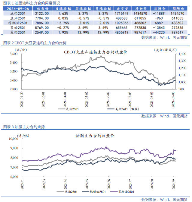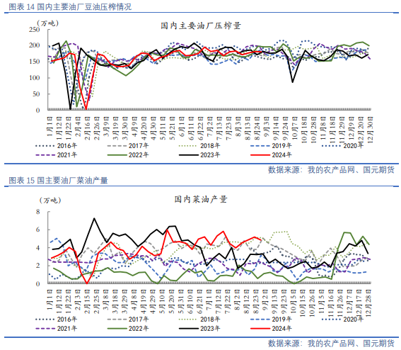 降息预期之下美豆空头回补,价格反弹至1100关口附近,叠加菜系供应忧虑扰动,豆粕跟涨。国内来看,国内进口大豆到港高峰将过,而现货持续走低提振部分下游企业备货积极性,豆粕季节性累库周期预计随着到港量回落而收尾。对于后市,我们认为短期内外供应宽松格局未变,豆粕主力上方仍将承压运行。商务部依法对自加拿大进口油菜籽发起反倾销调査的消息影响有所收尾,菜粕主力于2600关口附近承压。从菜系基本面来看,若反制措施落地,国内供强需弱格局预期趋紧,支撑盘面价格,不过,当前国内油厂压榨进度正常,水产养殖高峰已过,饲料需求受限,菜粕整体下游观望气氛较浓。重点关注政策发酵程度,本周以强势看待。