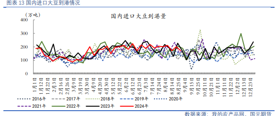 据Mysteel农产品团队对国内各港口到船预估初步统计,预计2024年8月1050万吨,9月850万吨。24年7月份国内主要地区125家油厂大豆到港预估150.5船,共计约978.25万吨(本月船重按6.5万吨计)。