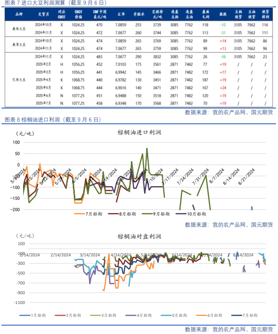 近期美元降息预期推高美元计价大宗商品价格中枢,CBOT大豆反弹至1100关口附近。国内来看,进口大豆到港高峰已过,胀库问题带动油厂维持高开机率,豆油供应充足,尽管接近中秋、国庆节假日,但油脂消费提振有限,整体维持供强需弱格局,价格短期受成本端提振,但中期来看上方压力仍存。高频数据显示马棕8月出口环比大幅下滑,本月期末库存环比增加预期较强,印尼B40利多扰动有所收尾,内外盘棕油上方承压。国内方面,8月以来国内进口利润再度转向疲软,限制四季度买船,不过前期买船到港对国内棕榈油库存补充较强,高库存宽松现实仍将继续延续,限制价格上方空间。商务部依法对自加拿大进口油菜籽发起反倾销调査的消息影响有所收尾,盘面开始回归供应宽松的基本面交易。若后续继续采取反制措施,国内进口菜籽量将受限制,供应端存在趋紧预期,支撑价格。