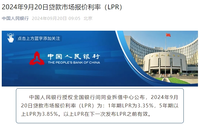 据中国人民银行微信公众号消息,中国人民银行授权全国银行间同业拆借中心公布,2024年9月20日贷款市场报价利率(LPR)为:1年期LPR为3.35%,5年期以上LPR为3.85%。以上LPR在下一次发布LPR之前有效。