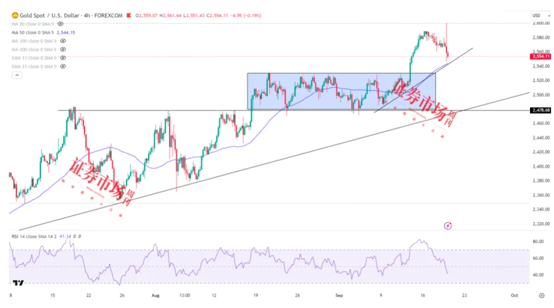 黄金的走势也备受关注。黄金在降息决定公布之后短线冲上2600美元刷新历史新高,但随后回吐涨幅回落至2559美元一线。