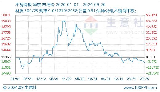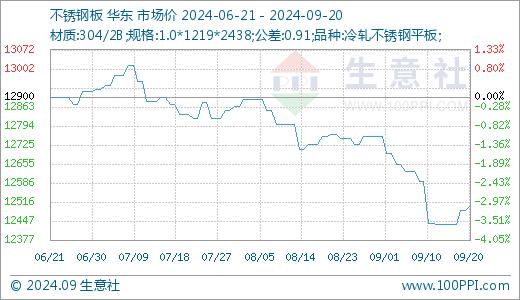 据生意社价格监测,本周不锈钢价格小幅上涨。截止9月20日,现货304/2B不锈钢平板1.0*1219*2438(公差0.91)的日均价为现报价12500元/吨,较周初上涨0.52%,同比下跌11.35%。