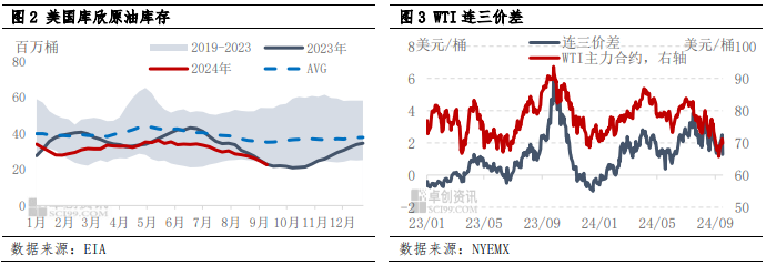 然而对于国际原油价格来讲,不仅要看宏观影响,原油作为体量庞大的大宗商品,其本身的价格表现就与商品属性息息相关,供需关系预期是中长期影响油价的重要因素。当前基本面对国际油价一定支撑,截至9月13日当周,美国库欣库存去库197.9万桶,库欣地区库存触及5年同期库存水平最低位,而月差结构也显现“现强期弱”,连三价差仍处于较高水平;但是国际原油价格下行的重要利空点就在于市场对于未来需求放缓叠加供应增加后原油的供过于求预期,OPEC+延长减产也未能改变供应过剩的实质问题,市场的交易情绪悲观,能源机构以及各大投行纷纷下调2024年-2025年国际油价预期,WTI原油非商业净持仓在空头增加中下降。因此,综合来讲,原油缺乏实质性的利好因素支撑,基本面也在出行旺季结束后进入了支撑减弱阶段,当前的反弹阶段也可视作整体下行趋势中由降息引起的阶段性反弹的延续,但是预计也是短期调整,整体仍然不改震荡偏弱走势。