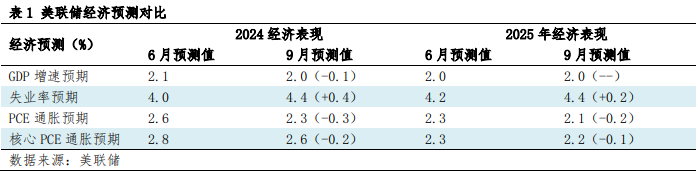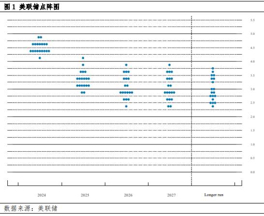 (2)预期未来经济仍是“软着陆”。就像鲍威尔在会后发言中多次强调的“美国经济状况良好”表述一致,美联储公布的经济预测中也显示经济韧性仍存,美国或仍是“软着陆”预期。其中,美联储对GDP增速预期进行了小幅下调;对代表通胀水平的个人消费指数(PCE)和核心PCE也进行下调,2024年通胀和核心通胀预测分别下调0.3和0.2个百分点,2025年的则下调0.2和0.1个百分点;失业率上调,将2024年失业率预期上调0.4个百分点至4.4%,2025年也上调至4.4%。但总体来看,美联储预计美国经济增长仍然具有动力,2025至以后仍将保持2%的经济增速,并且对抗通胀保持信心,通胀将会逐步回归于2%的目标水平,而关于就业市场,也证明了美联储对就业市场风险保有预期,鲍威尔也在发言中多次对劳动力市场相关问题做出回应,较以往更为承认劳动力市场降温,但也表示“仍处于一定水平”。