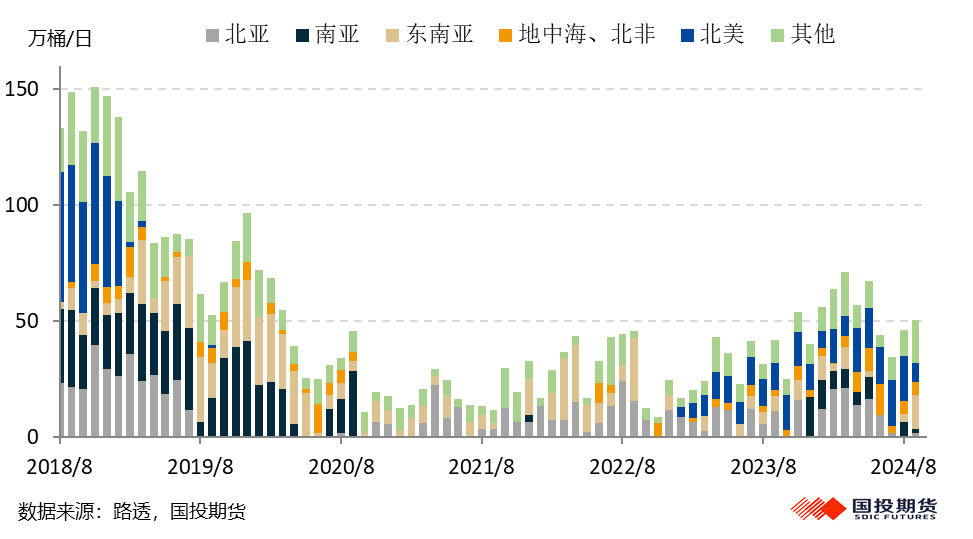 6月以来委内瑞拉石油发运量平均约为45万桶/日,较1至5月平均发运量63万桶/日有所减少。从目的地来看,委油去向仍较为多元化,且发往北亚地区的量明显减少,与国内地方炼厂沥青开工率持续低位的特征相吻合。在此背景下,预计委油难回低价,稀释沥青加工利润亦持续受到压制。