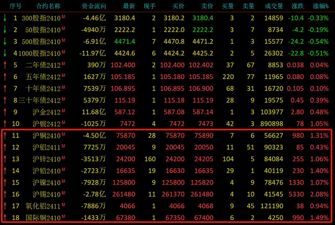 9月20日本周五早盘时段截至10:30时,由于美联储超预期降息50个基点影响,市场宏观氛围有所好转,国内期市早盘延续整体偏强表现,其中,有色金属板块相关品种,早盘时段均以不同程度的上涨节奏为主,沪锡主力合约,涨幅超2%;沪铜、沪锌、沪铅和沪镍主力合约,涨幅分别超1%。