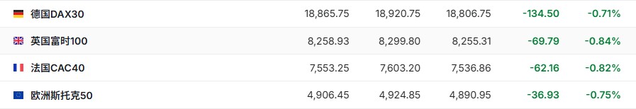 2. 截至发稿,德国DAX指数跌0.71%,英国富时100指数跌0.84%,法国CAC40指数跌0.82%,欧洲斯托克50指数跌0.75%。