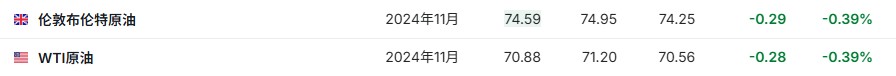 3. 截至发稿,WTI原油跌0.39%,报70.88美元/桶。布伦特原油跌0.39%,报74.59美元/桶。