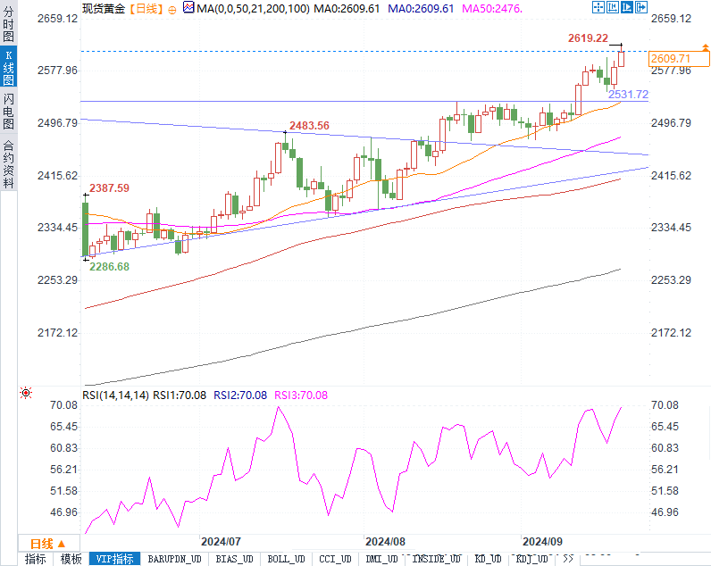 从技术面来看,现货黄金价格在突破2600美元的历史新高后,仍然处于强劲的上升趋势中。技术分析中的“趋势是你的朋友”格言适用于目前的黄金市场,意味着在长期、中期和短期均符合上涨趋势的情况下,金价有望进一步上行。