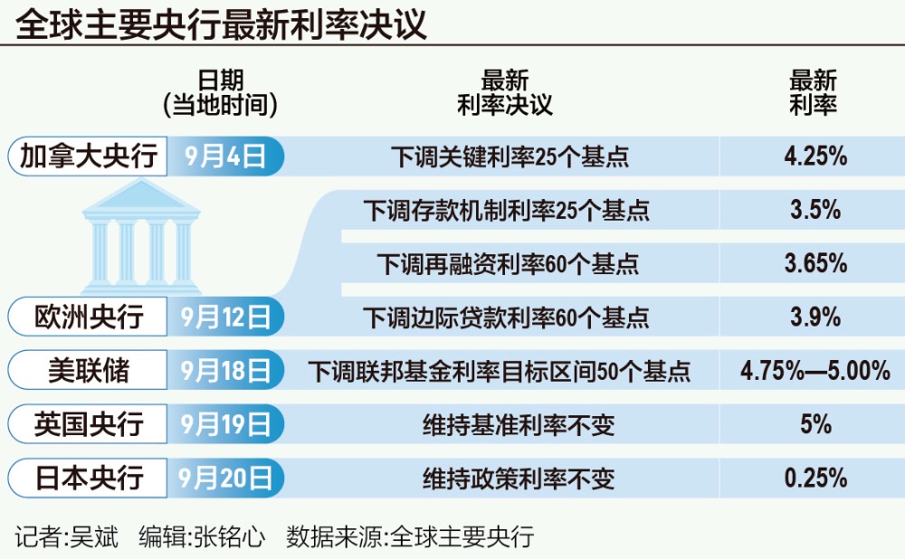 21世纪经济报道记者吴斌 上海报道 在9月早些时候加拿大央行和欧洲央行降息后,超级央行周再添一把火,全球主要央行降息大潮的声势已经开始壮大。