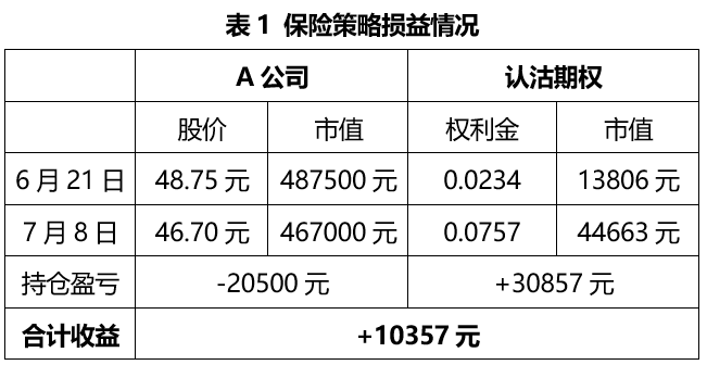 7月8日,老王对所持期权进行了卖出平仓。保险策略持续期间,A公司的股价由48.75元下跌至46.70元,跌幅达4.21%,现货持仓亏损20500元,而科创50沽7月800的价格由0.0234上涨至0.0757,期权持仓盈利30857元,策略整体盈利10357元,收益率为2%。
