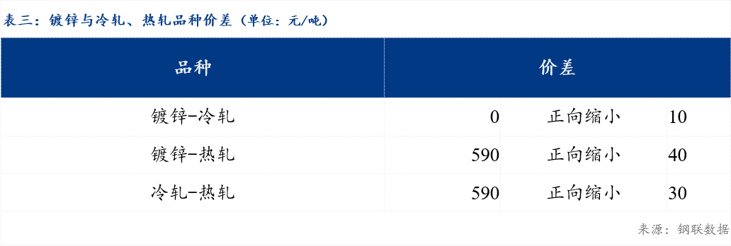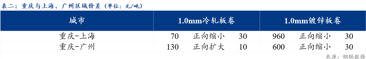 重庆、上海地区冷轧板卷区域价差正向缩小30元/吨;重庆、广州冷轧板卷区域价差扩大10元/吨。重庆、上海镀锌板卷区域价差缩小30元/吨;重庆、广州镀锌板卷区域价差缩小30元/吨。镀锌、冷轧品种价差缩小10元/吨;镀锌、热轧品种价差缩小40元/吨;冷轧、热轧品种价差缩小30元/吨。
