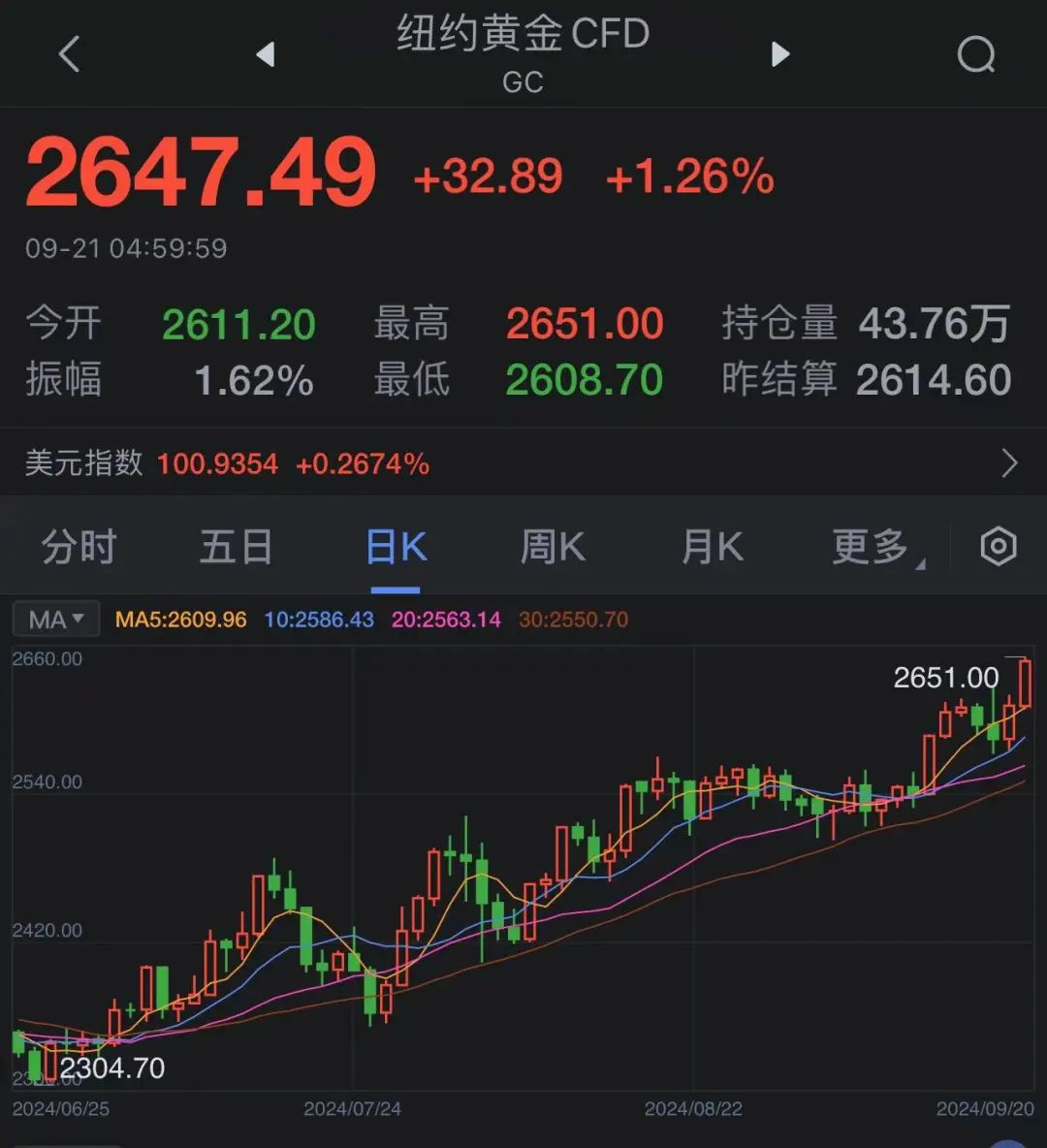 昨夜,纽约黄金大涨1.26%,盘中最高触及2651.00美元/盎司,再创近期历史新高。今年以来,黄金价格已累计上涨27%。