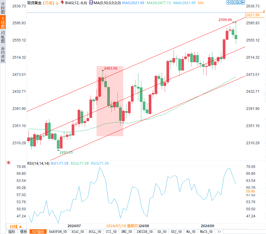 根据Sengezer的分析,本周黄金的日线图相对强弱指数(RSI)已经升至70,表明价格接近超买区域。当前金价仍运行在自6月底以来的上行通道的上半部分,而通道的上沿位于2630美元/盎司,形成重要阻力位。