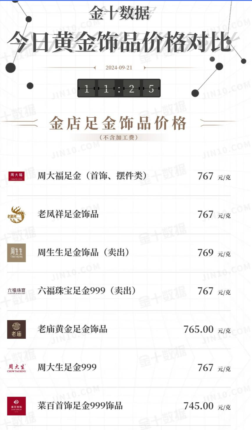金价的持续飙升也推升了国内金饰价格。金十数据显示,9月21日,周大福、老凤祥等多家金店黄金饰品价格创下767元/克的高价。