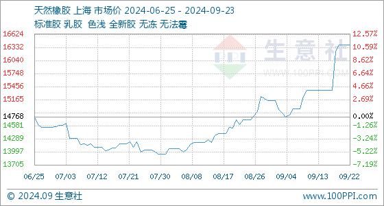 9月23日,生意社天然橡胶基准价为16380.00元/吨,与本月初(15146.00元/吨)相比,上涨了8.15%。