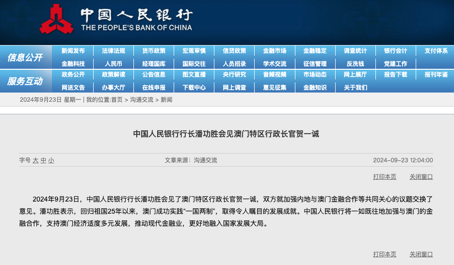 9月23日,中国人民银行行长潘功胜会见了澳门特区行政长官贺一诚,双方就加强内地与澳门金融合作等共同关心的议题交换了意见。潘功胜表示,回归祖国25年以来,澳门成功实践“一国两制”,取得令人瞩目的发展成就。中国人民银行将一如既往地加强与澳门的金融合作,支持澳门经济适度多元发展,推动现代金融业,更好地融入国家发展大局。