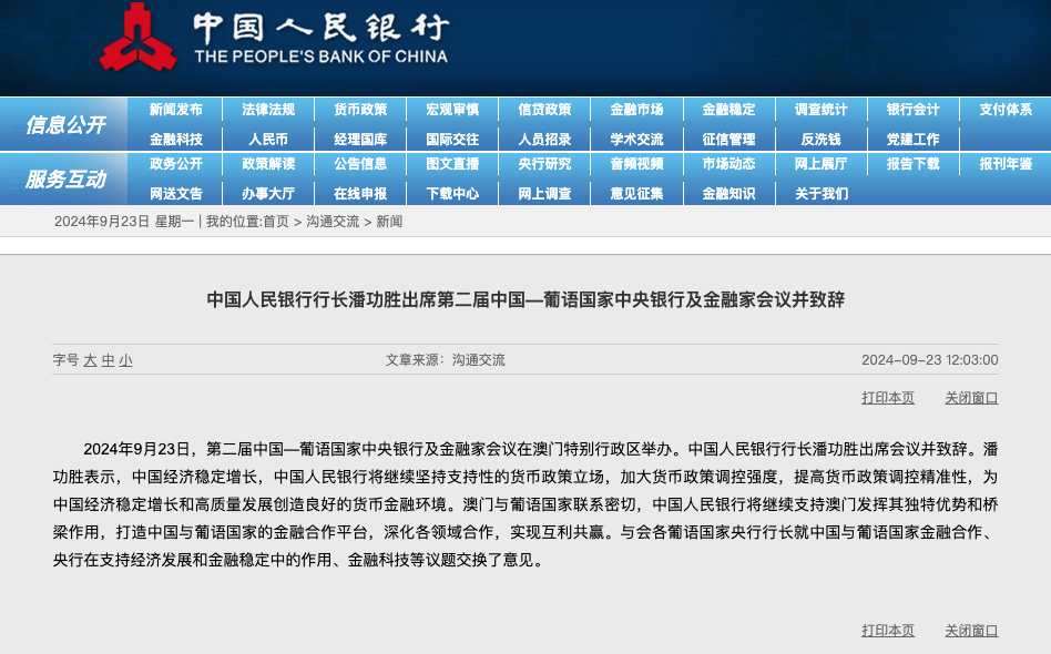 9月23日,第二届中国—葡语国家中央银行及金融家会议在澳门特别行政区举办。中国人民银行行长潘功胜出席会议并致辞。潘功胜表示,中国经济稳定增长,中国人民银行将继续坚持支持性的货币政策立场,加大货币政策调控强度,提高货币政策调控精准性,为中国经济稳定增长和高质量发展创造良好的货币金融环境。澳门与葡语国家联系密切,中国人民银行将继续支持澳门发挥其独特优势和桥梁作用,打造中国与葡语国家的金融合作平台,深化各领域合作,实现互利共赢。与会各葡语国家央行行长就中国与葡语国家金融合作、央行在支持经济发展和金融稳定中的作用、金融科技等议题交换了意见。