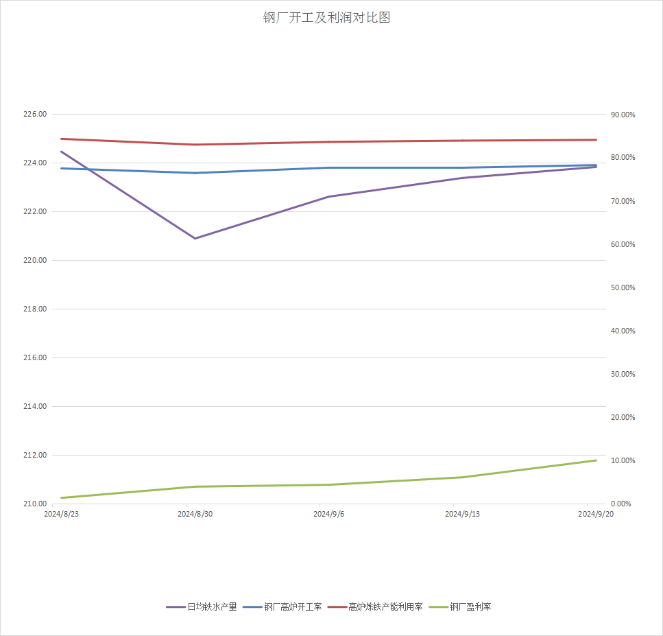 需求方面,截至9月20日,钢厂高炉开工率78.23%,周环比上升0.6%;高炉炼铁产能利用率84.06%,环比上升0.17%;钢厂盈利率9.96%,环比增加3.9%;日均铁水产量223.83万吨,环比增加0.45万吨;当前样本钢厂的进口矿日耗为276.81万吨,环比增加1.48万吨。上周钢厂开工情况、铁水产量维持增长趋势。上周下游钢材行情有所回落,而铁矿价格下行后钢厂生产利润有所恢复,高炉复产操作增加,铁矿需求释放预增。随着钢厂利润水平恢复,叠加国庆假期节前补库,据上周钢厂停复产计划来看,本周复产量多于检修量,本周钢厂采购幅度预增,预计本周铁矿需求释放有所增加。
