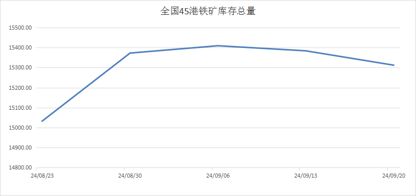 库存方面,截至9月20日,全国45个港口进口铁矿库存为15311.85万吨,环比下降71.69万吨;日均疏港量为315.45万吨,周环比减少11.45万吨;在港船舶数103条,与上周相比增加2条。上周铁矿港口库存情况如上图;全国钢厂进口铁矿库存总量为9032.66万吨,周环比减少57.76吨。上周港口疏港量小幅增长,港口库存止增回落。随着钢厂复产操作持续进行,本周疏港量会有所增长,加上海外发运有下降预期,港口库存有持续去库可能,本周仍需要多关注港口铁矿库存变化。