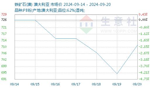据生意社商品行情分析系统显示,上周(9.14-9.20,下同)铁矿价格震荡下行、趋弱运行。截至20日,生意社铁矿价格指数为711.56,环比下行1.99%,具体如上图。上周铁矿价格窄幅震荡,整体趋弱震荡运行,其主要原因假期效应发酵,交易日减少期货投机行情偏弱;不过下游成材行情向好利好钢厂利润修复;而与此同时,港口库存量再度维持下降趋势,钢厂利润低位,但仍维持一定开工规模,采购需求持续释放,供减需增基本面利好铁矿价格,所以上周铁矿价格窄幅震荡运行。