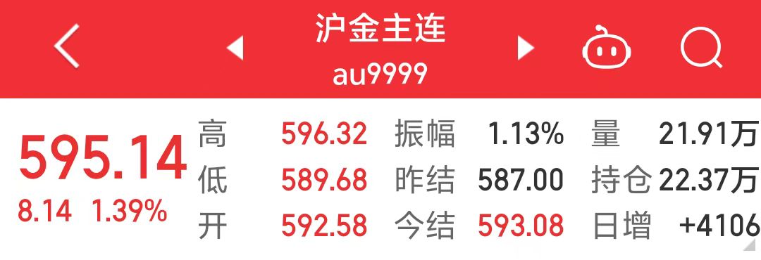 9月23日,上期所黄金期货主力合约报595.14元/克,涨幅1.39%,续刷历史新高,今年迄今已涨超20%。