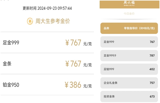 9月23日,据南财快讯记者查询,周生生足金饰品价格报768元/克;周大生足金999报767元/克,金条报767元/克;周六福足金999报767元/克,足金999.9报787元/克,均维持在700元/克的高位以上。