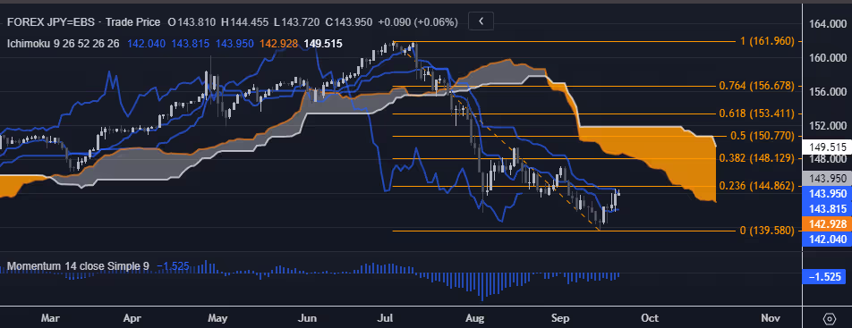 知名机构分析师指出 ,美元/日元的14天动能指标仍为负值,表明整体看跌情绪依旧浓厚。一目均衡转换线和基准线的负向排列,进一步强化了日元的看跌前景。若日元持续在144.86附近受阻,市场可能会再度测试近期低点139.58,甚至进一步下探。