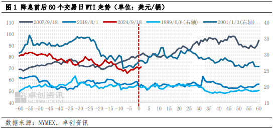 短期来看,降息初期市场风险偏好上行带动油价延续反弹走势,但此轮降息计价早已开始,带动原油价格反弹向上空间有限。回顾过去的四轮降息周期,降息靴子落地后的10个交易日内油价或呈现“小涨-跌-涨”走势,一震荡运行为主,而超过10个交易日后,油价走势分化,交易关注点或转向基本面和未来降息节奏等因素。
