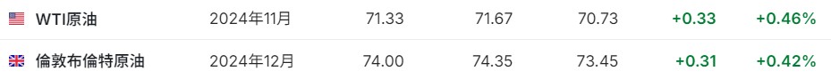 3. 截至发稿,WTI原油涨0.46%,报71.33美元/桶。布伦特原油涨0.42%,报74.00美元/桶。