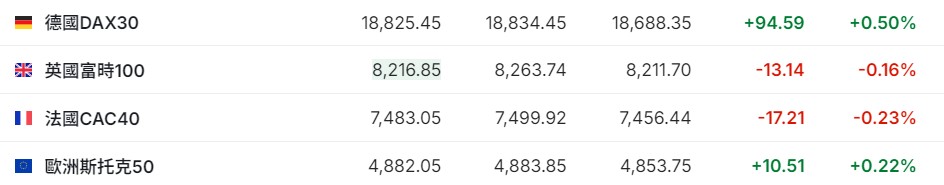 2. 截至发稿,德国DAX指数涨0.50%,英国富时100指数跌0.16%,法国CAC40指数跌0.23%,欧洲斯托克50指数涨0.22%。