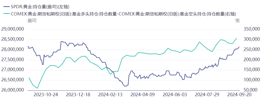 图四. 黄金ETF持仓和COMEX黄金期货净多头持仓