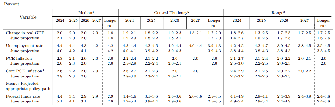 虽然点阵图的利率预期大幅下调,但会后公布的经济展望显示,美联储官员对近期的经济预期并未大幅调整,将今年的GDP增长预期小幅下调0.1个百分点,明后两年的GDP预期不变,今年的失业率预期上调0.4个百分点,明后两年的上调0.2个百分点,今年的PCE通胀预期和核心PCE通胀预期增速分别下调0.3个和0.2个百分点,明年的分别下调0.2个和0.1个百分点。美联储主席鲍威尔也表示不认为经济衰退的可能性增加。整体上,美联储依然预期美国经济将软着陆。