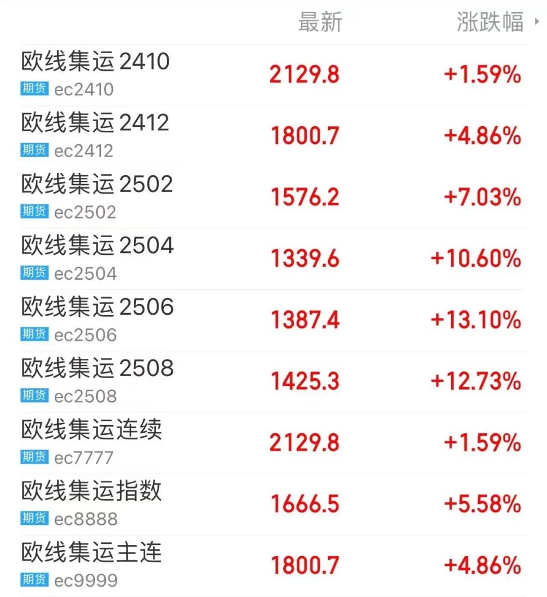 一德期货航运研究员车美超告诉记者,在刚刚过去的周末,黎以冲突进一步升级,市场风险情绪迅速升温,叠加上周五公布的欧线运价跌幅收窄以及“十一”长假前部分空单平仓,周一集运期货盘面迎来反弹。