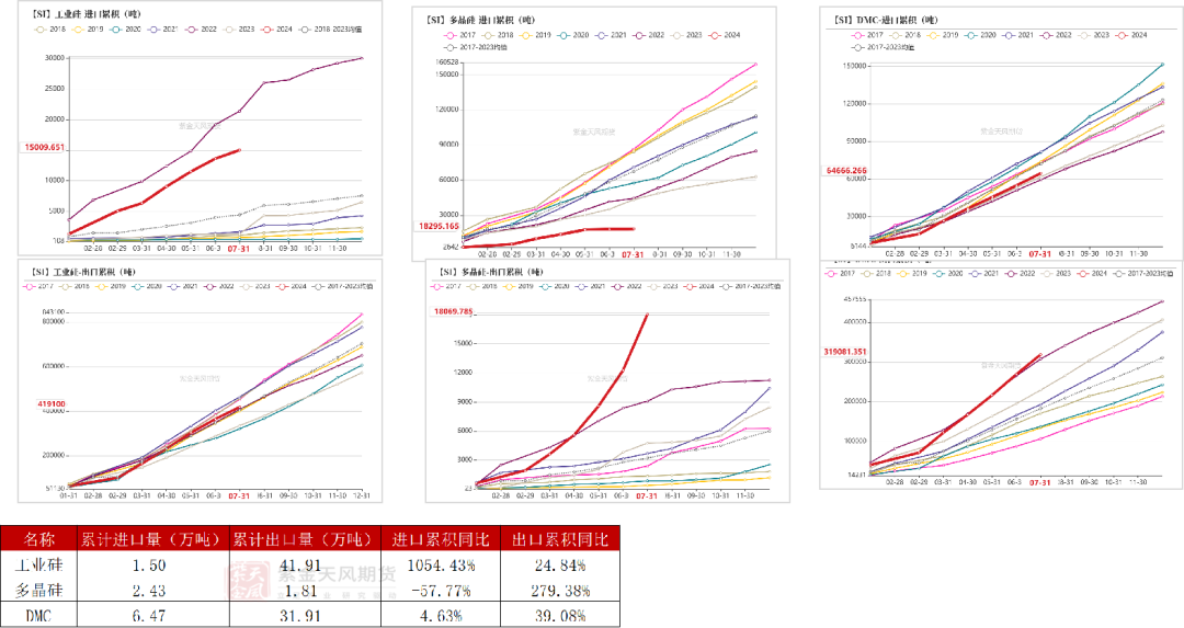 1-7月工业硅、多晶硅、有机硅出口表现较好,累计同比分别增长24.84%、279.38%、39.08%。
