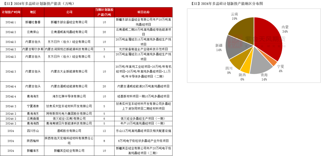 2024年工业硅计划投放的新产能数量及总量仍显充分,但实际落地的预期并不乐观。我们此前在半年报中提示,“云南地区工业硅大厂新产能的电力成本优势或难实现,结合其自身生产经营压力,新产能投放进度有进一步放缓的可能”,结合目前市场行情,云南地区产能或推迟至2025年初投产,初步预计将有5-10万吨/年的产能落地。