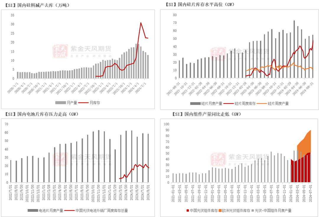 多晶硅方面,2024H1即便头部硅料厂家生产成本有所下降,但当前现货仍然低于头部企业生产成本,从硅料月度产量及库存来看,行业明显处于减产去库状态,且减产力度正如我们此前预期的有显著加大,同时产业链下游库存压力同样未有缓解,行业整体表现出举步维艰态势。后续关注龙头企业投产情况,若如期投产,硅料供应将进一步集中。此外,多晶硅期货计划上市,新进购买力短期内或将形成部分需求,但实际消化仍待下游缓解库存压力。