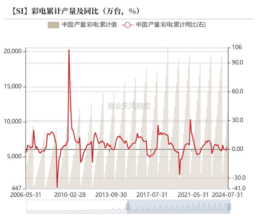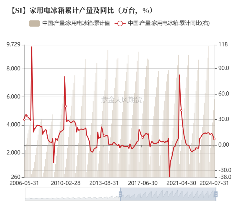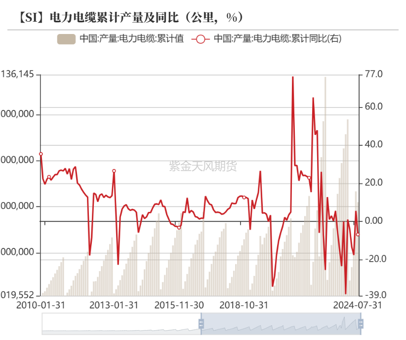 2024年1-7月,家用电器累计产量及累计同比基本延续正增长,但增速逐渐放缓,电力电缆累计同比自3月以来表现为负增长,但负增长有逐渐修复趋势,一定程度上跟随原料有色金属涨跌的波动。